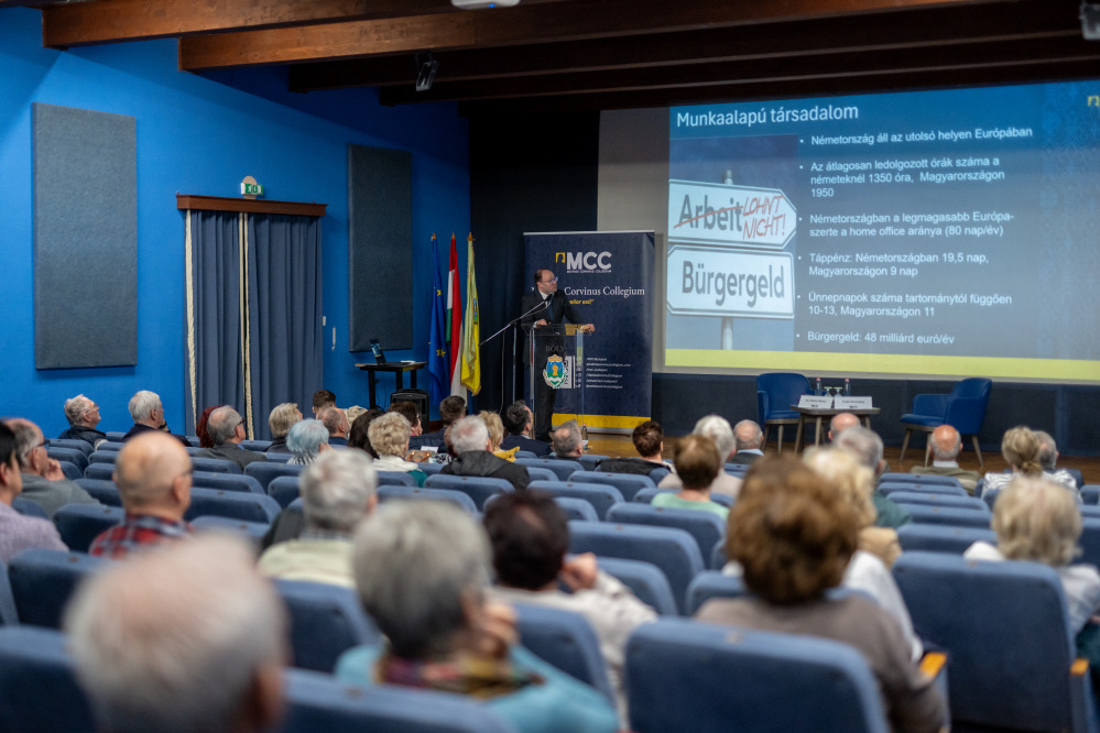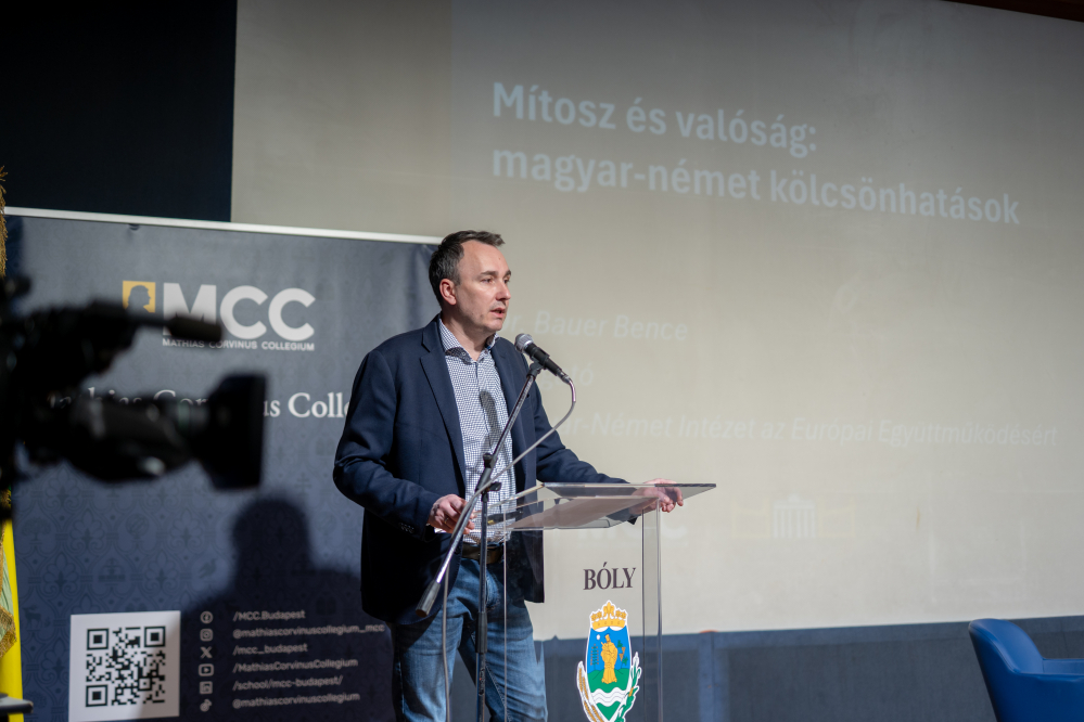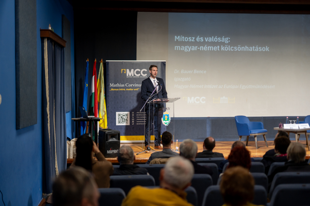 Am 11. März 2026 hielt Dr. Bence Bauer, Direktor des Deutsch-Ungarischen Instituts für Europäische Zusammenarbeit, in Bóly einen Vortrag mit dem Titel „Mythos und Realität – deutsch-ungarische Wechselwirkungen“, der gemeinsam mit dem MCC-Bildungszentrum in Pécs organisiert wurde. Die Veranstaltung wurde vor mehr als 40 interessierten Teilnehmern besucht von Krisztián Erdei, dem Leiter des Ausbildungszentrums in Pécs, eröffnet. Anschließend hob Bence Bauer in seinem Vortrag hervor, dass das Bild, welches die deutschen öffentlich-rechtlichen Medien von Ungarn zeichnen, oftmals vielmehr auf Deutschland zutrifft. Er wies darauf hin, dass sich das frühere „Vorzeigeland“, das Deutschland für Ungarn verkörperte, in der letzten Zeit gewandelt habe. Es lohne sich, die Eisenbahnnetze beider Länder, die Qualität der Internetversorgung, das Tempo der Infrastrukturentwicklung, die Bekämpfung des Drogenmissbrauchs, aber auch die Meinungsfreiheit miteinander zu vergleichen. In jedem Fall ist Ungarn in einer besseren Lage – betonte Bauer. Aufschlussreich ist auch die Statistik, die zeigt, dass fast 75 % der deutschen Bevölkerung der Meinung sind, der Staat könne seine Aufgaben nicht angemessen erfüllen. Der Direktor führte weiter aus, dass die Migrationsprozesse und die daraus resultierenden sozialen Probleme in Deutschland enorme Geldsummen verschlingen und der deutsche Staat zudem statt sich um wichtige Dinge zu kümmern, beispielsweise mit der Legalisierung von Drogen und der Ideologisierung der Kirchen beschäftigt sei. Bauer wies darauf hin, dass es sich lohne, diese Entwicklungen mit den Verhältnissen im eigenen Land zu vergleichen. Das MCC Pécs organisierte zum ersten Mal eine Veranstaltung in Bóly in Zusammenarbeit mit der Gemeinde Bóly. Der Saal des Erzsébet Vigadó war bis auf den letzten Platz mit Interessierten gefüllt.