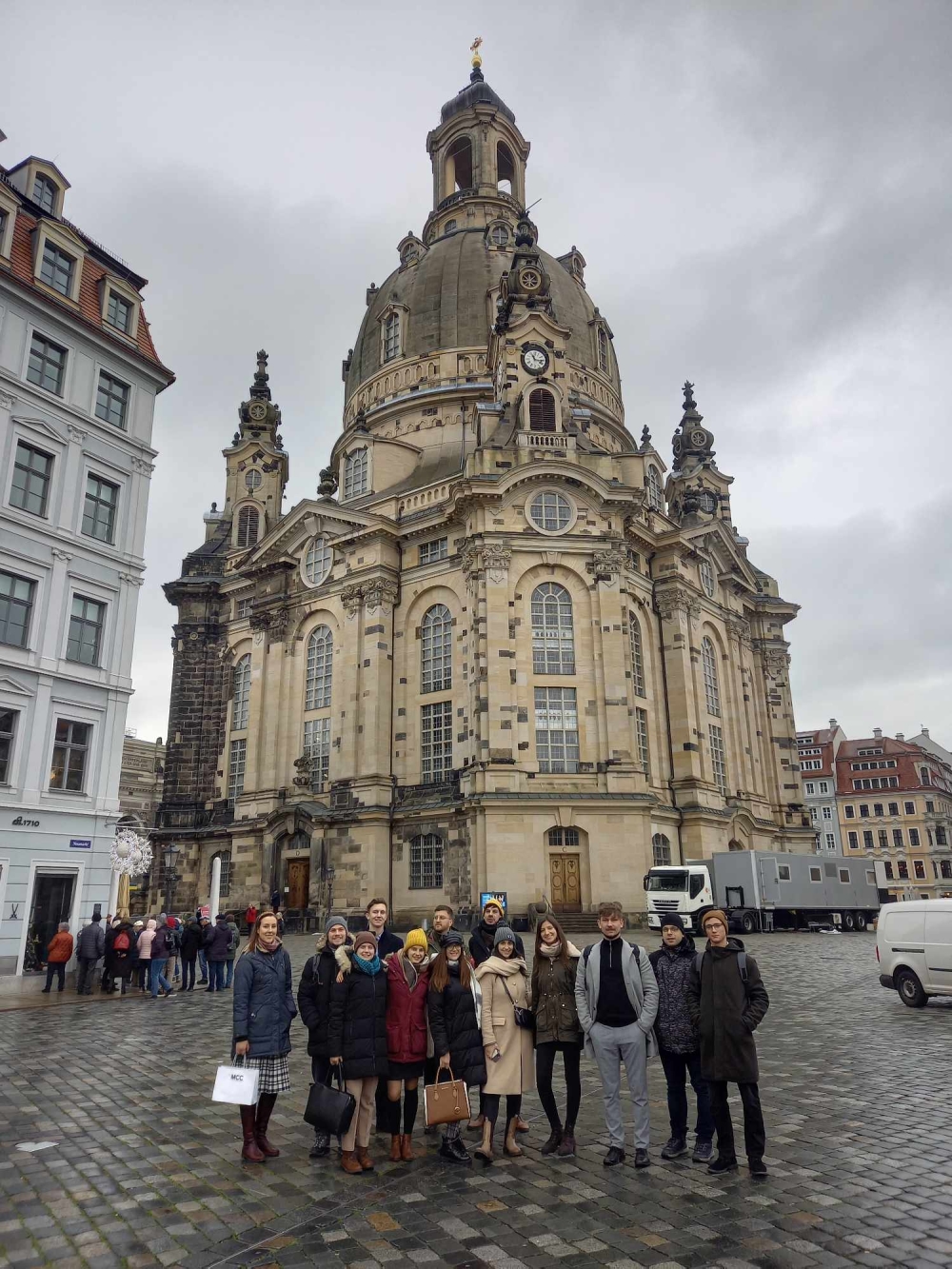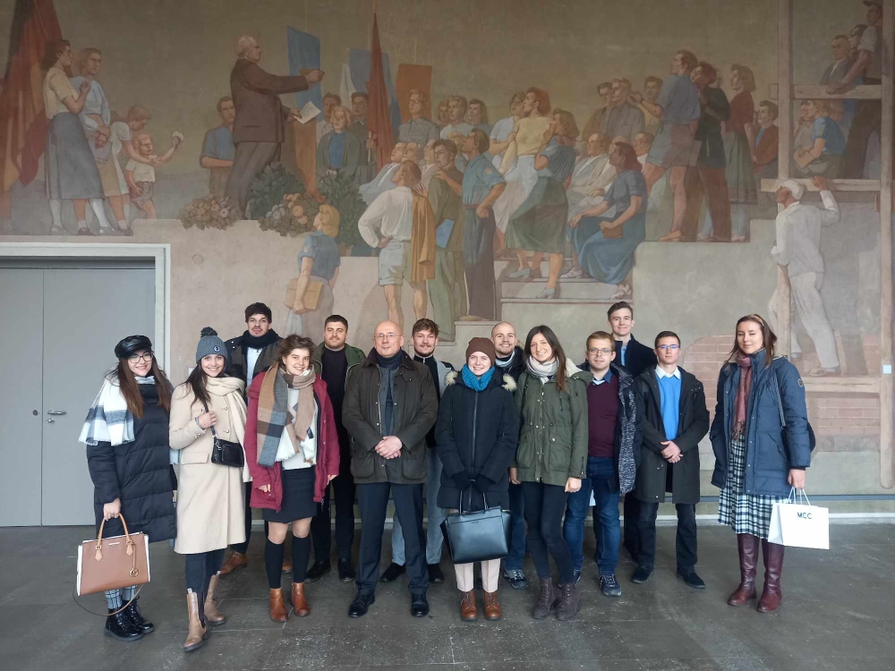 A hétfői első programpont a Drezdai Műszaki Egyetemre vezetett, ahol Dr. Ulrich Fröschle, a médiatudományok és a modern német irodalom professzora vezetéssel egybekötve mutatta be a drezdai egyetem történelmét és jelenlegi kihívásait, majd délelőtt a diákok belülről is megcsodálhatták Drezda egyik legikonikusabb épületét, a Frauenkirchét. A II. világháborúban lerombolt templom újjáépítése a német újraegyesítés után, 1993-ban kezdődött és 2005-ben ért véget, így ma már ismét teljes szépségében pompázik a Neumarkt közepén. A látogatás keretében a hallgatók az alsótemplomban helyet foglaló, a templom történetét és az újjáépítés folyamatát bemutató kiállításokat is megtekinthették. A délután folyamán a Konrad-Adenauer-Stiftungnál (KAS) tett látogatásuk során Ronny Dirk Heinével, a CDU-hoz közeli pártalapítvány szászországi irodavezetőjével volt lehetőségük beszélgetni a diákoknak. Heine kiemelte a KAS szerepét a CDU támogatásában, mely leginkább az állampolgárok informálására irányul, valamint felvázolta a jövő évi tartományi parlamenti választások kilátásait. A diákok kérdései mentén a migrációs politikáról is szó esett, mégpedig, hogy mennyire differenciálatlan a bevándorlók befogadási rendszere, amivel jelenleg a német kormány és az EU is küzd. Ezt követően Dr. Jens Baumann-nal, Szászország kitelepítettekért felelős megbízottjával is volt lehetősége eszmecserét folytatni a csoportnak. Dr. Baumann bemutatta munkáját, és beszélt a „haza” fogalmáról, valamint a közel 150 ezer kitelepítettről és későn hazatelepültről, akik Szászországban élnek. Szó esett továbbá Szászországnak a szorbokat érintő kisebbségi és integrációs politikájának jelentőségéről is, hiszen, ahogyan Dr. Baumann is mondta: „A haza alapvető szükséglet.” Ezután a csoport Frank Möhrerrel, MDR médiaszolgáltató korábbi bizottsági tagjával vacsorázott, amely során a médiafogyasztás átalakulásáról, a nyomtatott sajtó jelentőségéről és a közszolgálati média tartósságáról is szó esett. A beszélgetés alatt a diákok megismerkedtek a ARD és ZDF állami műsorszolgáltató szervezet működésével és a kötelező műsorszolgáltatási díj jellegzetességeivel, ami Möhrer szerint versenytorzító hatással bír. Egy kulturális program keretein belül a diákok hétfő este megtekintették még a Distel „Wer hat an der Welt gedreht” című kabaréját. A Distel a második világháború végétől kezdődően az ideológiai nézetkülönbségek vitatásának színtereként vállalt szerepet a kelet-német társadalom életében. Ennek megfelelően ez a darab is aktuálpolitikai, gazdasági és társadalmi folyamatokat dolgozott fel humoros formában.