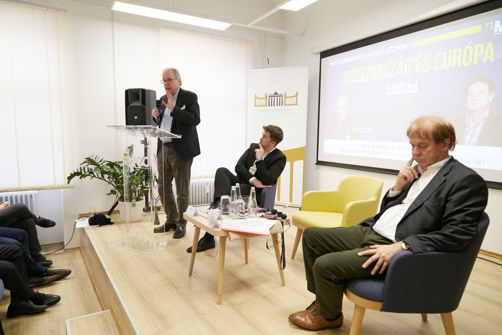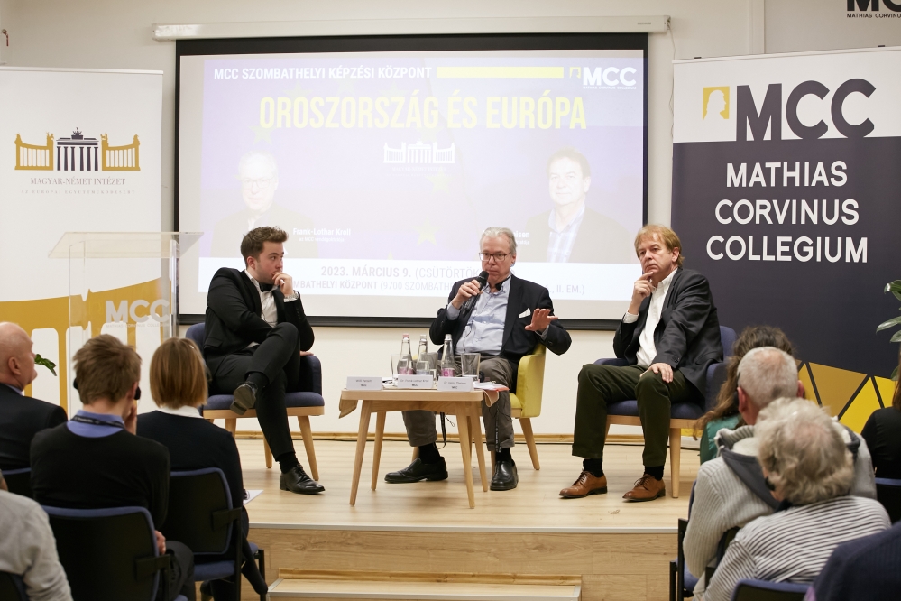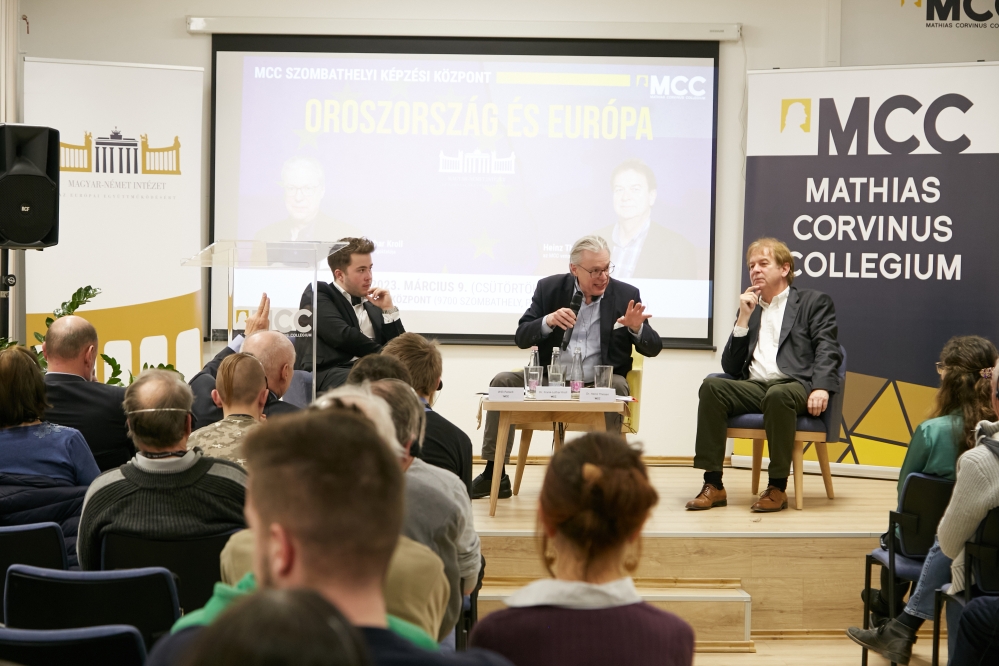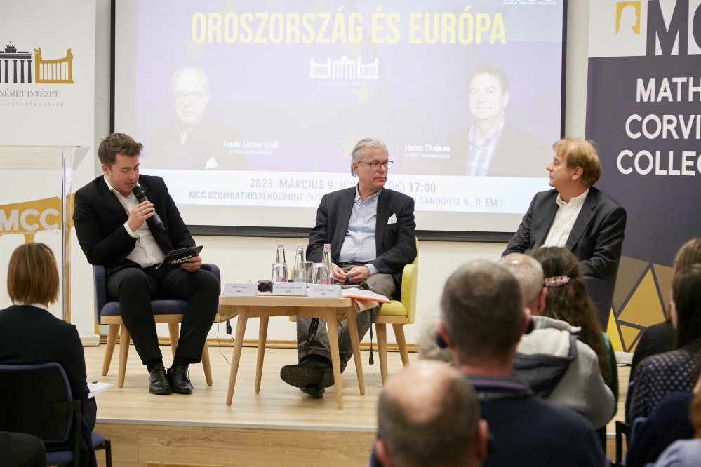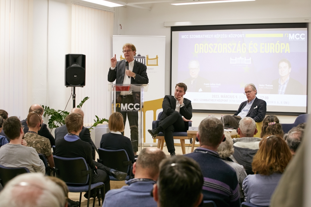 Das Thema „Russland und Europa“ wird auf Jahre hin das bestimmende Thema europäischer und weltweiter Sicherheitspolitik bleiben. Dementsprechend groß war das Interesse an der Diskussionsveranstaltungen im MCC Szombathely am 9. März 2023 mit ca. 60 Gästen. Moderiert von Willi Patzelt, erörterten der Historiker Prof. Dr. Frank-Lothar Kroll und Politikwissenschaftler Prof. Dr. Heinz Theisen - beide derzeit Visiting Fellows am Deutsch-ungarischen Institut für europäische Zusammenarbeit des Mathias Corvinus Collegiums - die drängenden Fragen zum Krieg in der Ukraine und der Rolle Russlands in der Welt.