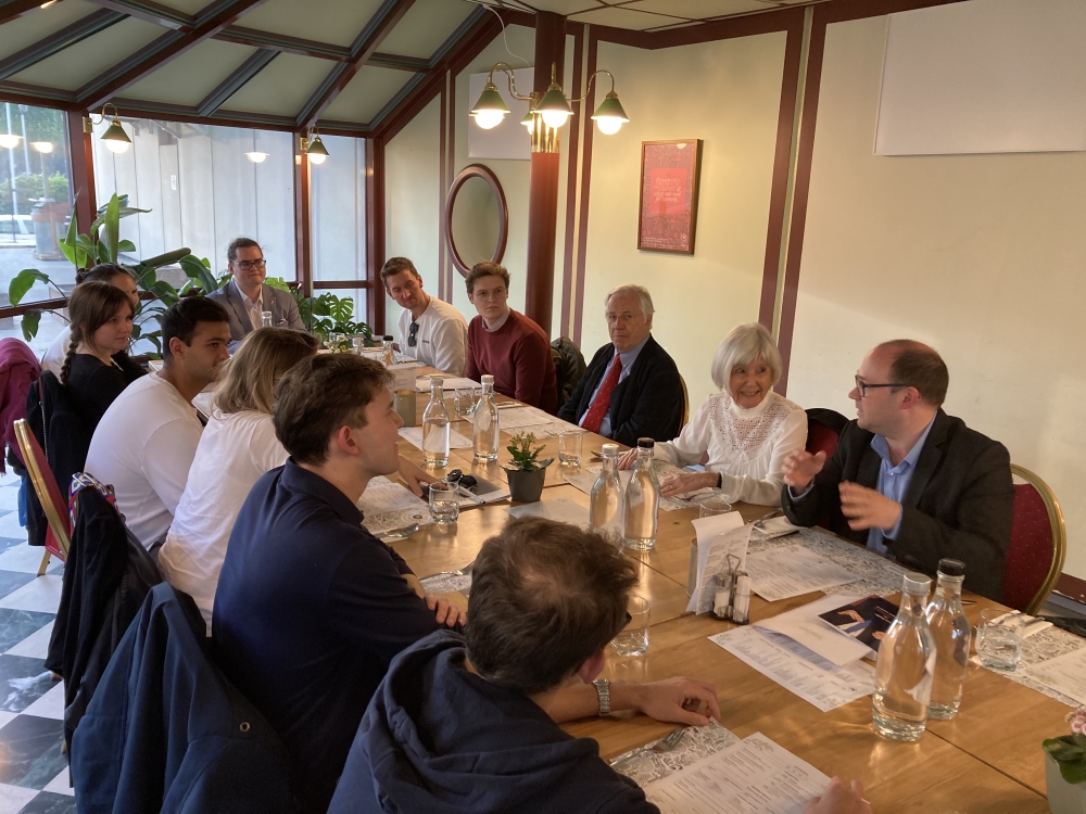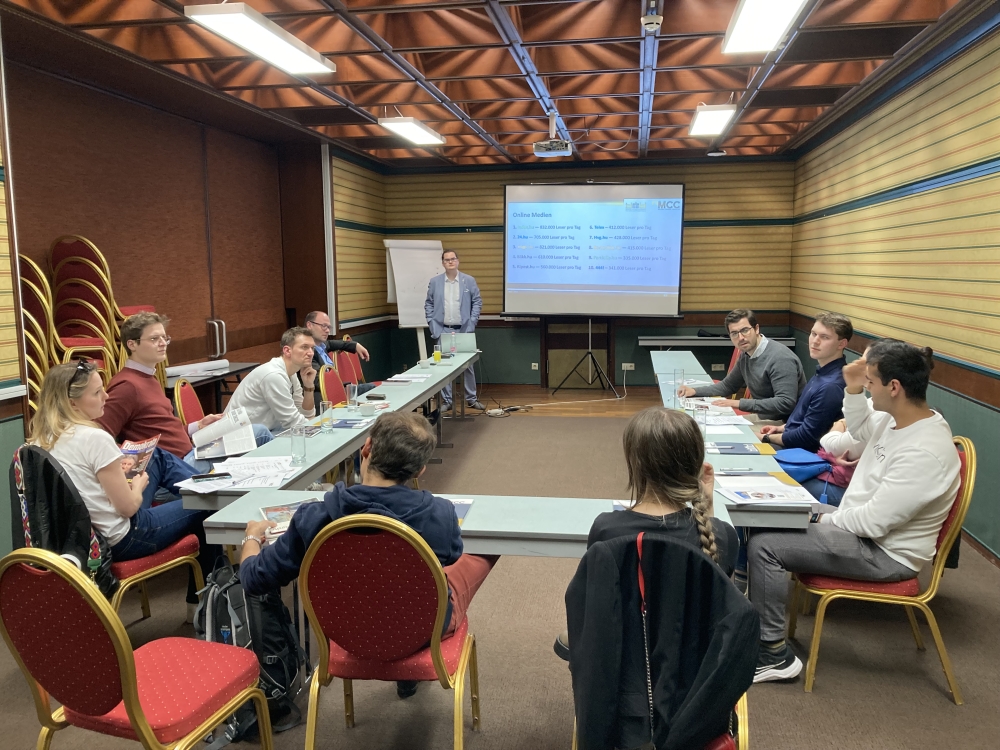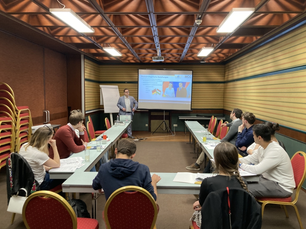 Miután április 19-én délután Darkó Tünde, az MNI kommunikációért és tehetséggondozásért felelős projektkoordinátora üdvözölte a csoportot az MCC-ben, és bemutatta az MNI-t, Alexander Rasthofer egy bevezető előadás keretében ismertette a magyar-német kapcsolatokat és a betekintést nyújtott Magyarország sajátosságaiba. Ezt követően egy vacsorával zárult az első nap programja, amelyen a résztvevők Bauer Bencével, az MNI igazgatójával és Prof. Dr. Tilo Schaberttel, az Erlangen-Nürnbergi Friedrich-Alexander Egyetem politológia professzor emeritusával találkozhattak.