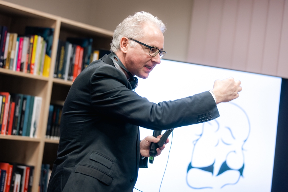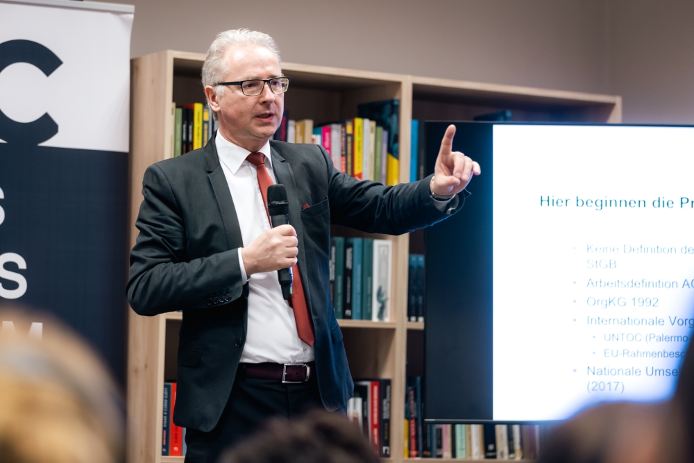 Dr. Asztalos Kata, az képzési központ igazgatója nyitotta meg a rendezvényt és köszöntötte Sinn professzort. Ezt követően Sinn úr rögtön ismertette előadásának felépítését, az este menetrendjét „Tények, tendenciák és stratégiák” sorrendben. Bemutatta a szervezett bűnözéssel kapcsolatos statisztikai eredményeket (legalábbis a sötét mezőn kívülieket), majd a szervezett bűnözés jogi vizsgálatába adott betekintést, ami egy kifejezetten nehéz feladat.